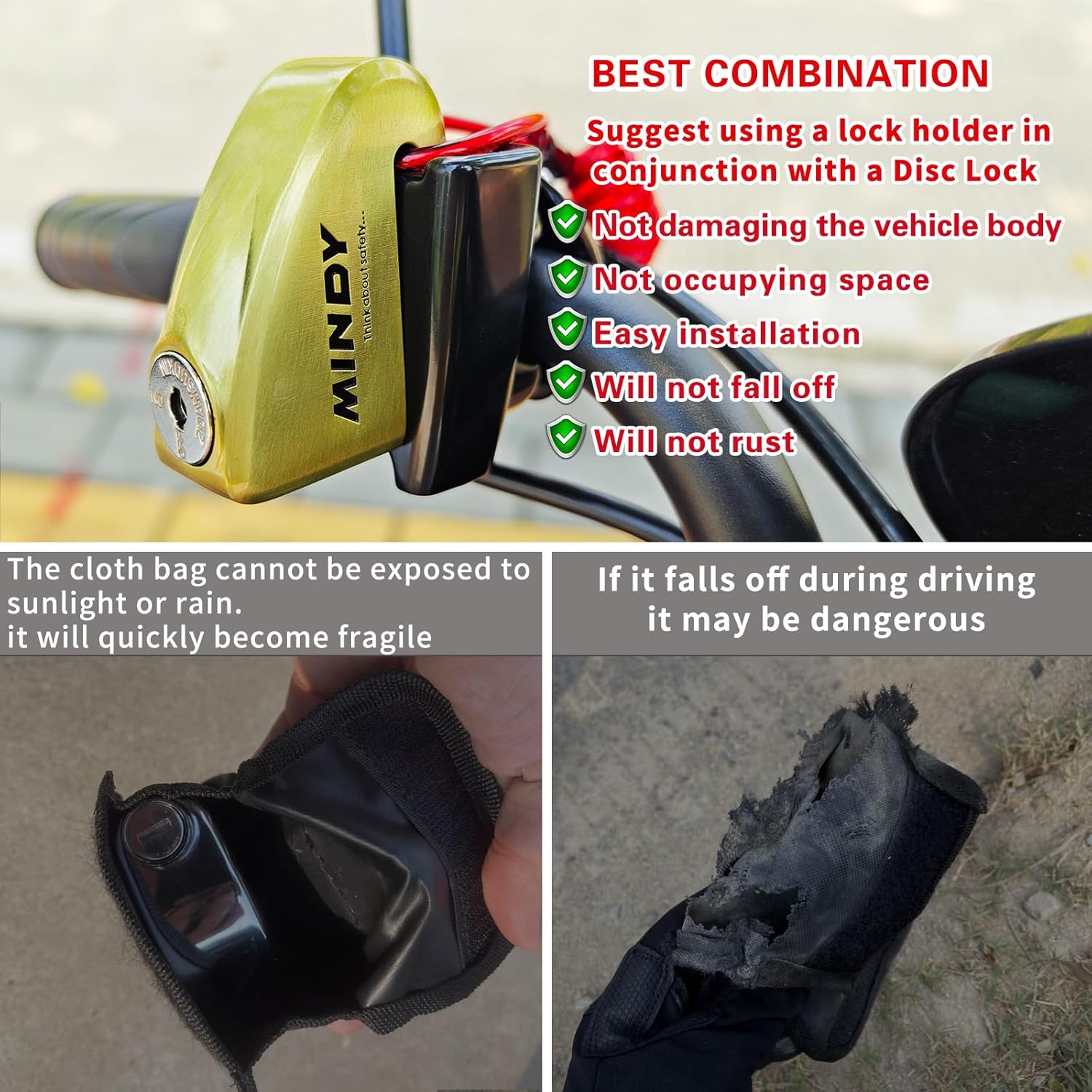 Forget about bulky, heavy locks that are a hassle to carry. The Mindy Bike Disc Lock is lightweight, compact, and easy to transport, allowing you to secure your bike without unnecessary weight. The included metal holder features a rubber coating that prevents noise and shaking while riding, making it easy to attach to your bike or carry in your bag.
